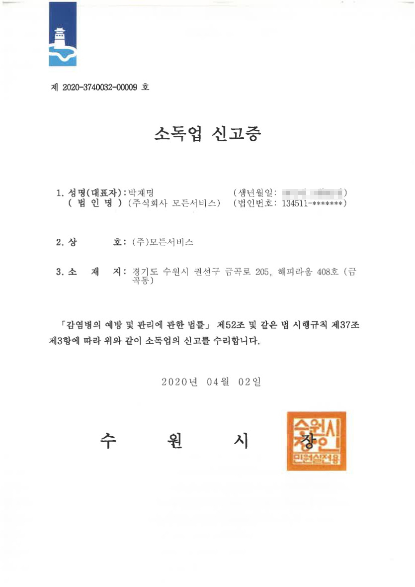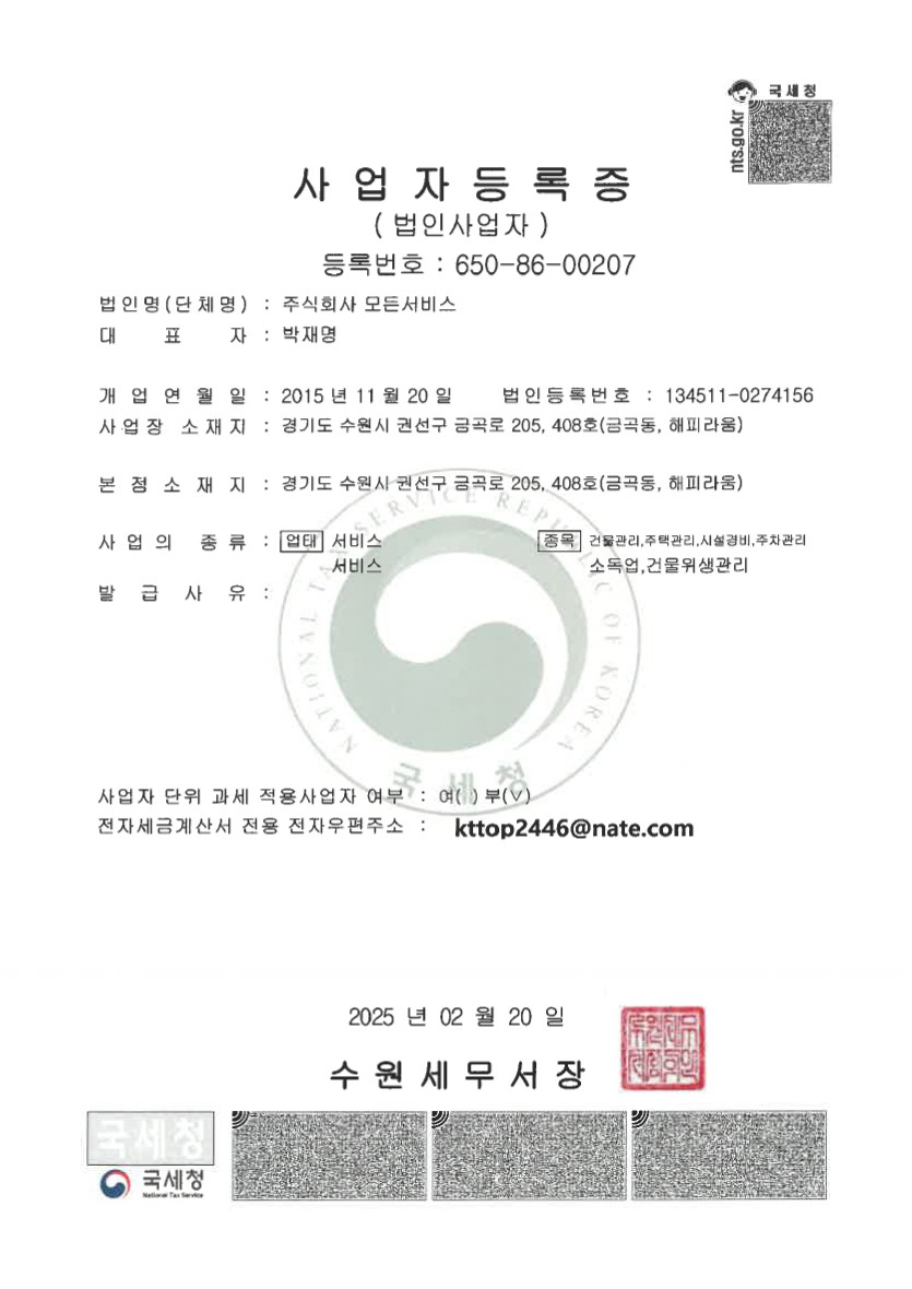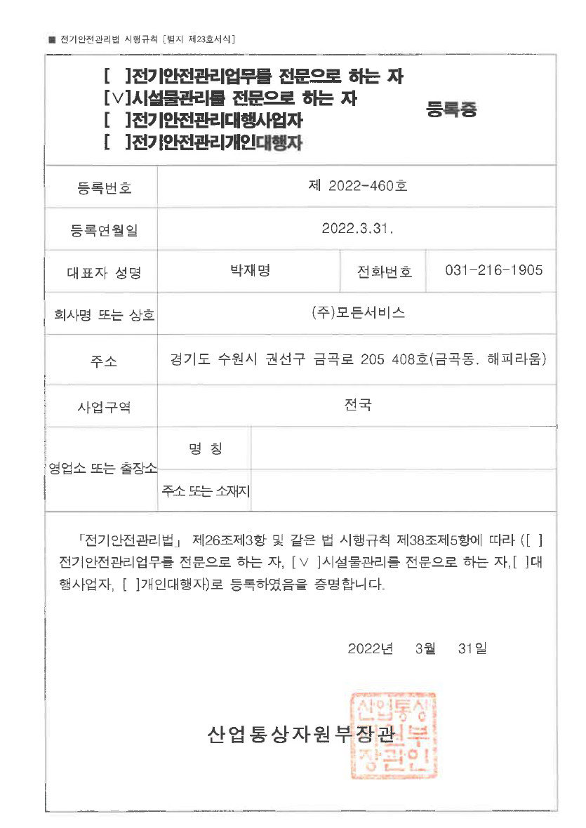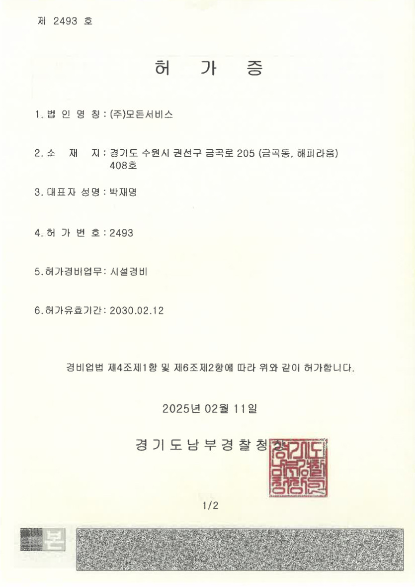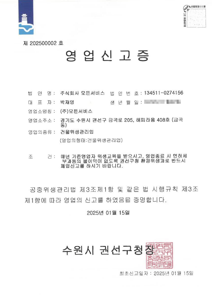 인/허가현황 사업자등록증 페이지 정보 작성자 최고관리자 댓글 0건 조회 94회 작성일 26-03-14 10:38 목록 본문 Total 5건 1 페이지 게시판 검색 열람중 사업자등록증 작성자 최고관리자 작성일 03-14 4 시설물관리를 전문으로하는자 등록증 작성자 최고관리자 작성일 03-10 3 소독업신고증 작성자 최고관리자 작성일 03-05 2 모든서비스 -시설경비 허가증 작성자 최고관리자 작성일 03-04 1 건물위생관리업 작성자 최고관리자 작성일 02-04 검색 검색대상 제목내용제목+내용글쓴이글쓴이(코) 검색어 필수 검색 닫기